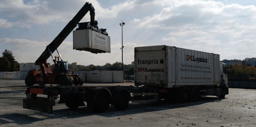 Puis plus écologique, sur le port de Bonneuil sur Marne, nous avons assisté au chargement sur barge fluviale de 45 conteneurs FRANPRIX, acheminés sur la Seine jusqu’au centre de Paris. Ainsi, la livraison du dernier km en ville de 170 magasins de l’enseigne, est réalisée avec des porteurs électriques ou à gaz. Changement d’échelle ici avec une capacité d’emport de marchandises plus importante par voie d’eau mais avec un déplacement plus lent.